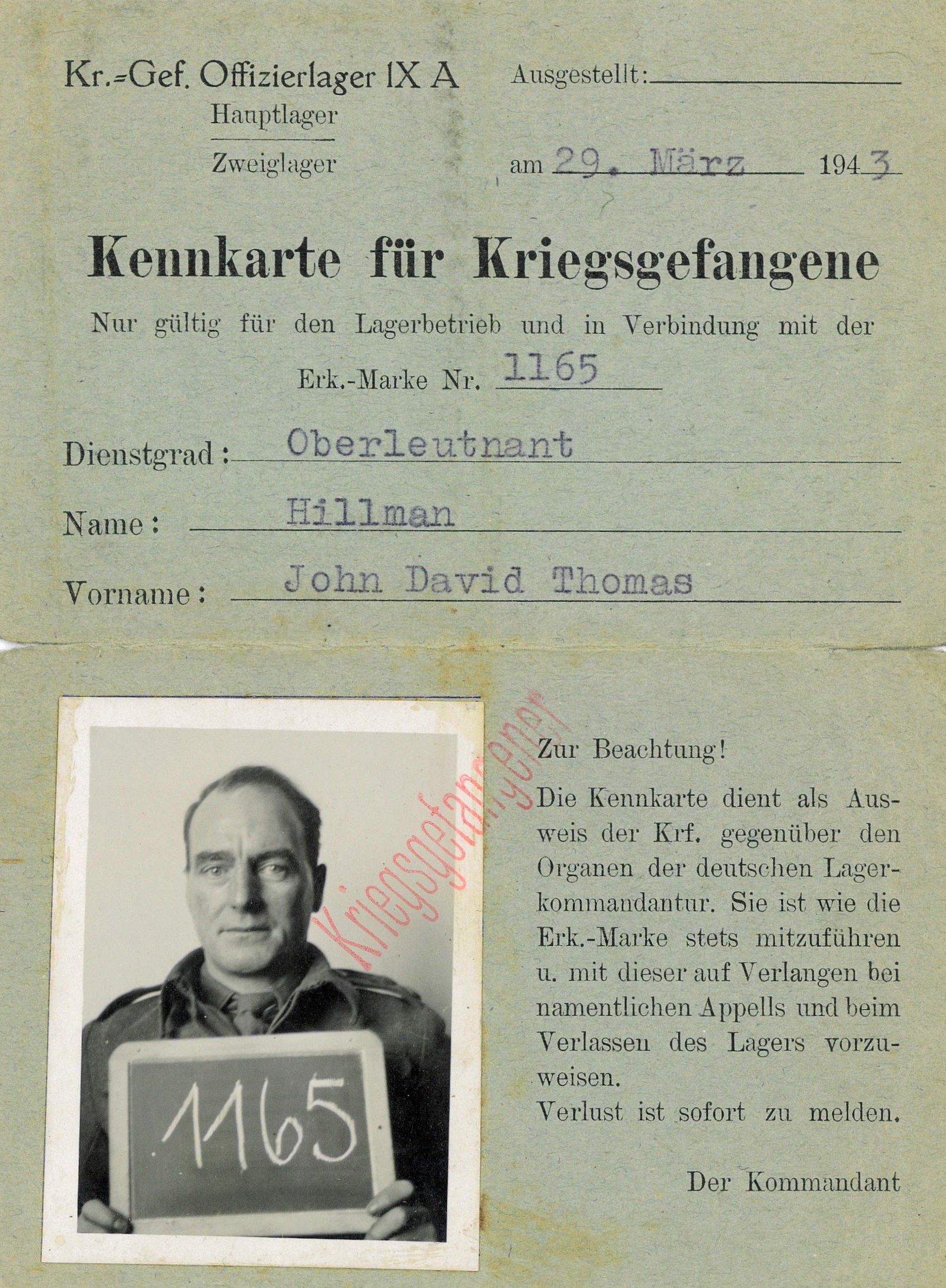 J. D. T. Hillman PoW ID Card