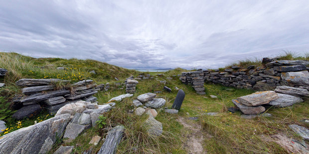Iain Crawford, a passionate archaeologist and ethnographer who was influenced by the writings of Erskine Beveridge, decided to concentrate his searches in the 1960s on sites that might have been continuously inhabited over a very long period and yet remained visible. He wanted to get a clearer picture of daily life and work from the Mesolithic, through to the Bronze and Iron Ages, onwards as close to the present day as possible. The two main sandhills at Udal, North and South, gradually provided him with settlement remains which represent the rarity and importance of this site. The Udal South Mound revealed evidence of two stone built round houses or 'wheelhouses', now extremely vulnerable to the elements. Pottery shards, stone tools and some bronze and metal items, held by Glasgow University, show evidence of habitation from the Late Bronze Age through to the Late Iron Age. The Udal North Mound takes the period of settlement up to Viking and Mediaeval times and the finds include jewellery and a Norse gold coin of Harald Hardrada. There is evidence of continuous settlement through to the 19th century and much more exciting excavation remains to be researched by the Udal project on this site of major historical significance.
