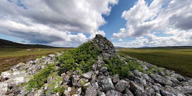 Barpa nam Feannag, ominously called Cairn of the Hooded Crows in English, is both less accessible and less well known than Barpa Langass. Erskine Beveridge described it as a long irregular mound of loose stones, lying approximately east and westâ. He noted that this barp was higher and wider at the east end, suggesting that there may have once been a chamber there with a large flat stone at the exterior base and a large rectangular opening presenting a sign of a possible entrance passage. He also recorded that the surface of the ground was excessively pitted by many slight hollows. The regularity, size and shape of these hollows suggests the original Neolithic structure, although he noted that none of the upright boundary slabs so characteristic of such cairns remained.
